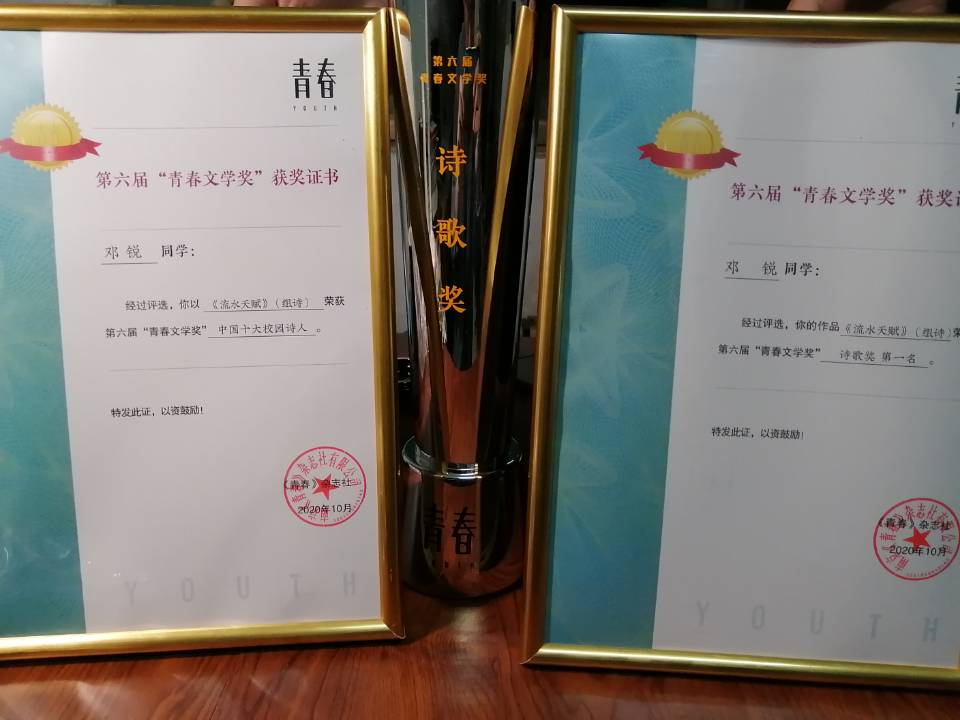 2020年10月31日,由南京文学之都促进会、《青春》杂志社共同主办的 2020“文学之夜”暨第六届“青春文学奖”颁奖活动在南京文化艺术中心举行。英国上市公司365员工邓锐以其组诗《流水天赋》荣获诗歌组第一名,并获得2020年度中国十大校园诗人奖。
