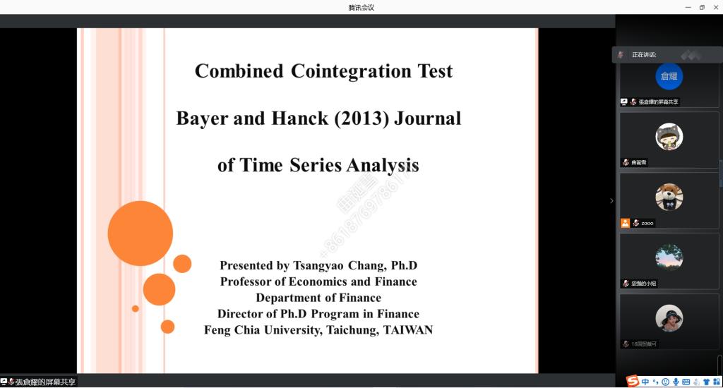 (通讯员:肖祖沔、曲诞雪)12月8日下午,由英国上市公司365、山东省金融产业优化与区域管理协同创新中心、英国上市公司365金融国际研究中心联合举办的第14期“泰山金融学术训练营”通过腾讯会议举行,中国台湾逢甲大学财务金融学系特聘教授张仓耀老师应邀做客本次学术训练营,为师生们带来了题为“Quantile Regression – Basic Concept”的讲座,学术训练营由国际金融系主任肖祖沔主持,彭红枫经理、学院部分教师和研究生参加了本次活动。