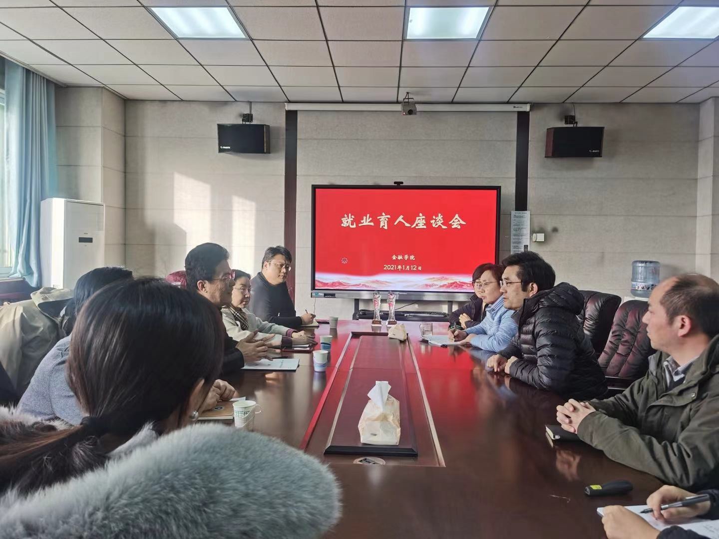 (通讯员:徐洁)1月12日下午,学校就业指导处来公司调研,在舜耕校区金融楼第三会议室召开就业工作座谈。学校就业指导处处长杨哲、副处长杜丽娜、周广春,以及何峰老师,公司经理彭红枫、党委副书记范志毅及相关辅导员参加了此次座谈会。