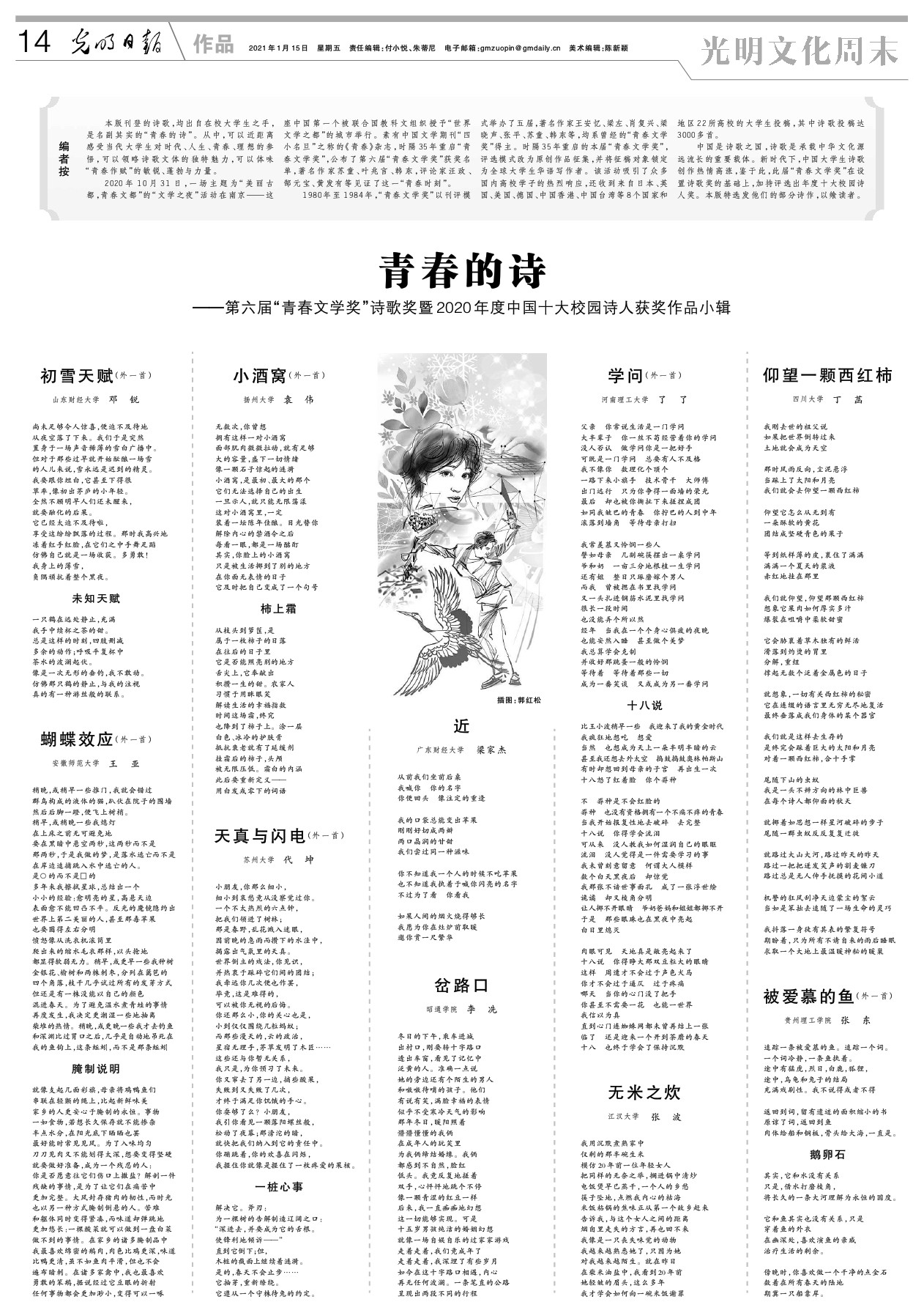 邓锐,系公司2017级英国上市公司365金融学专业员工。有作品发表于《青春》《星星》《诗歌月刊》等杂志。曾参加2019年中国新发现诗歌营、获2020樱花诗歌奖、第十届中国校园“双十佳”诗歌奖。
